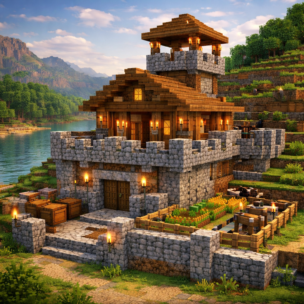 Next is material choice. Wood is fast but weak. Stone, cobblestone, and deepslate offer much better blast resistance. A strong early-game combo is cobblestone walls with a wooden interior. This keeps it safe without making it ugly. Make sure it is expandable by adding multiple layers or adding nice details to the building.